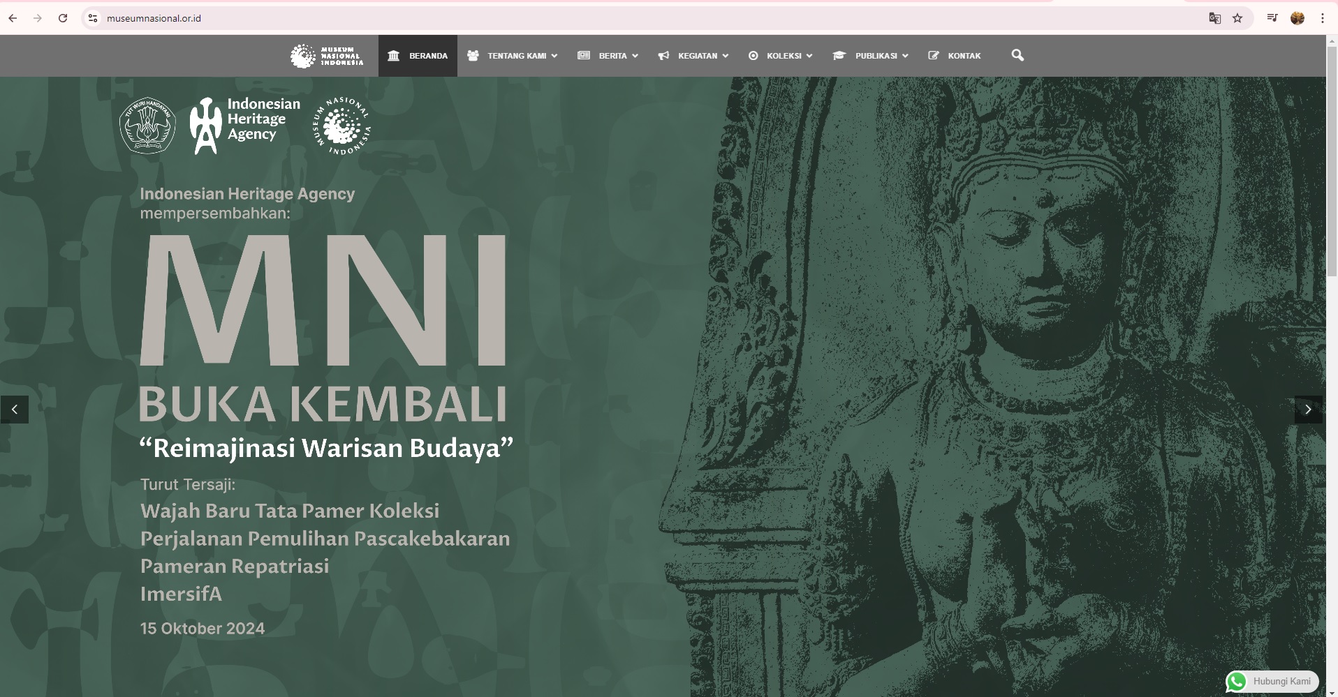 Akses digital Museum Nasional Indonesia bisa kita lihat melalui laman https://www.museumnasional.or.id. atau https://www.museumnasional.or.id/virtual-tour/ Museum Nasional memiliki beberapa artefak dari berbagai daerah yang bisa kamu lihat. Di antaranya berasal dari Palembang, Wonoboyo, Klaten, Magelang, dan Cirebon. Sementara jenis artefak yang ada di sana antara lain adalah pahatan patung, mahkota, dan topeng.