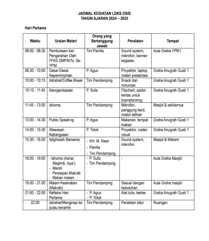Setelah terpilihnya Ketua OSIS dan Wakil Ketua OSIS Masa Bakti 2024/2025 beserta jajaran pengurus OSIS lainnya se-YPM. Forum Komunikasi Kepala Sekolah (FKKS) Se-YPM, menyelenggarakan kegiatan Latihan Dasar Kepemimpinan Siswa (LDKS). Kegiatan tersebut dilaksanakan pada :