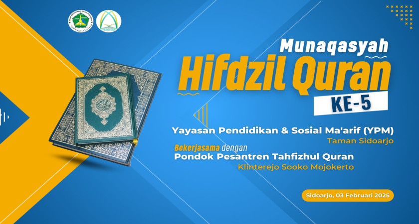 Yayasan Pendidikan dan Sosial Ma'arif (YPM) Taman Sidoarjo bekerja sama dengan Pondok Pesantren Tahfizhul Qur'an Klinterejo Sooko Mojokerto, menyelenggarakan kegiatan Munaqasyah Hifdzil Quran ke-5 Tahun Ajaran 2024/2025 yang bertempat di Masjid Al Ma`arif YPM Desa Ngelom Kec. Taman Kab. Sidoarjo. Acara ini dilaksanakan pada tanggal 3 Februari 2025. Kegiatan tersebut dilakukan untuk mengukur kemampuan para peserta Tahfidzul Qur'an yang sudah menempuh kelas Tahfidz selama 3 tahun.